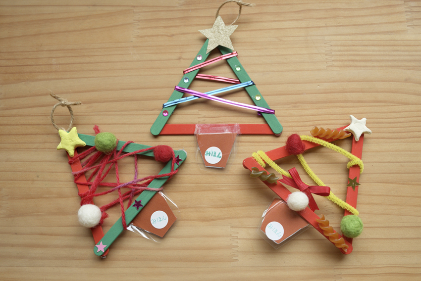 アイスの棒でのオーナメント作りでは、子どもたちがおもいおもいにツリーをデザインしました。きらきらとした飾りをいっぱいにつけたツリー、クリスマスカラーの毛糸をぐるぐる巻きにしたツリーなどを、手作りしました。子どもの内面にある世界観が、あらわれました。