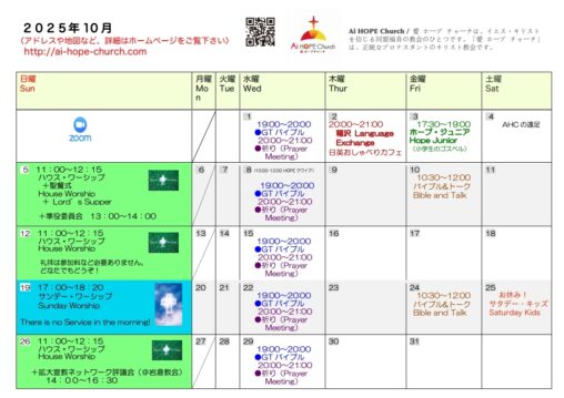 Bible Study: every Wednesday from 7:00 pm 〜 Bible and Talk: 2.&4. Friday from 10:30 〜 Biblestudy (Wednesday)10/1, 10/8, 10/15, 10/22, 10/29 19:00 〜 20:00 Bible and Talk…
